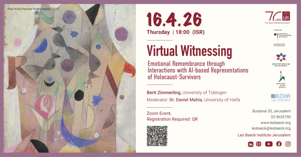 Emotional Remembrance through Interactions with AI-based Representations of Holocaust-Survivors Berit Zimmerling, University of Tübingen Moderator: Dr. Daniel Mahla, University of Haifa Zoom Event, Registration Required.